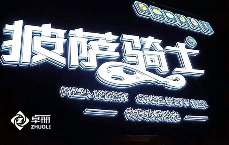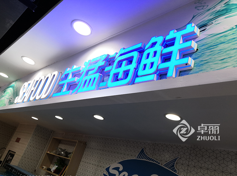 商超发光字室内外通用,面板由液态亚克力浇灌固化成型,户外使用不黄变、不开裂,解决了树脂字户外发黄的问题,商超发光字使用的是特质铝型材边带,带有特殊凹槽设计,考虑了亚克力的收缩系数及专用内漆,就防止了开裂现象。